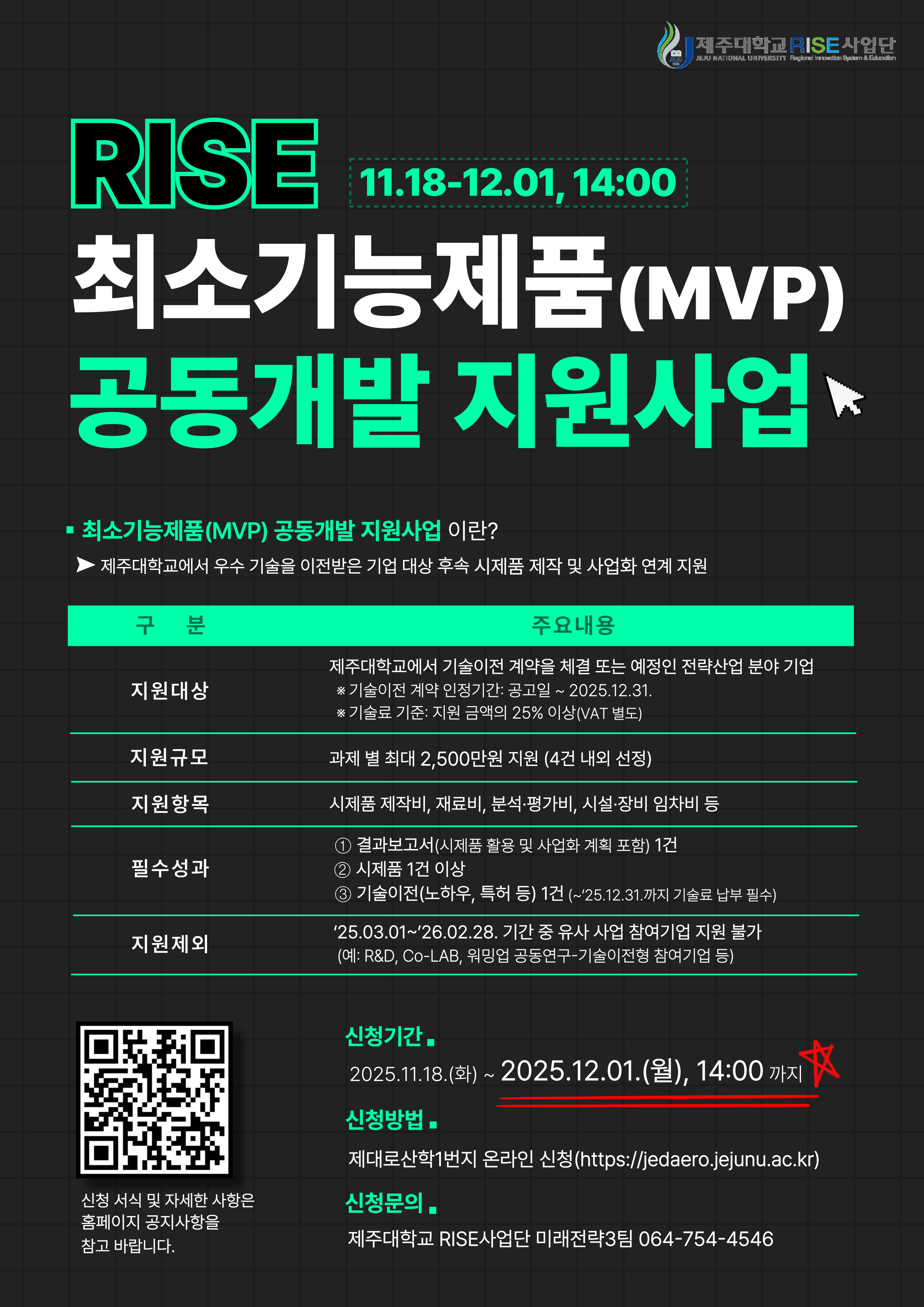 제주대학교 RISE사업단에서는 대학이 보유한 우수 기술을 기업이 이전받아 실제 제품화 가능성을 검증하고, 시제품 제작을 통한 기술사업화 촉진을 위한 최소기능제품(MVP) 공동개발 지원사업을 운영합니다. 많은 관심과 참여 바랍니다.
