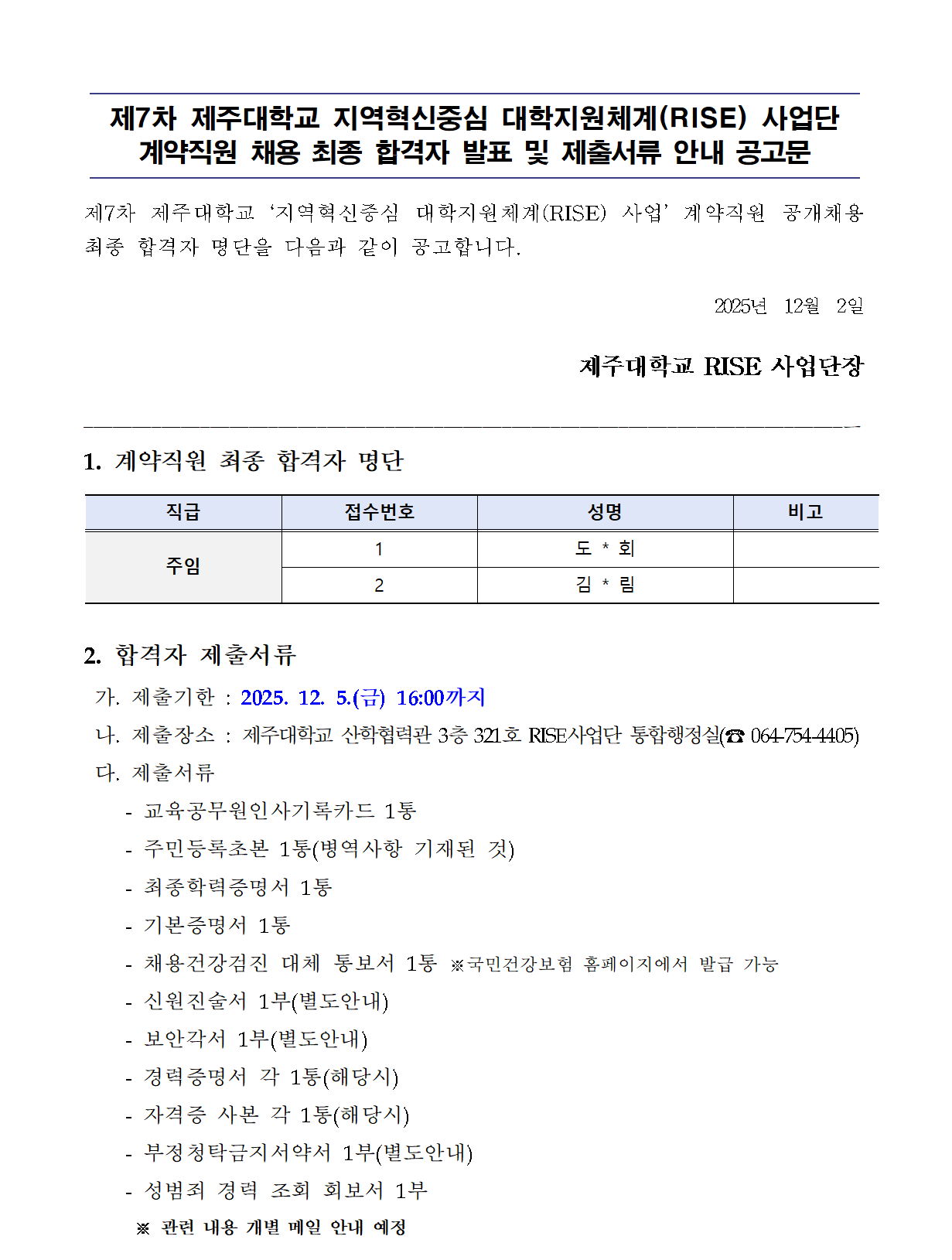 제7차 제주대학교 지역혁신중심 대학지원체계(RISE) 사업단 계약직원 채용 최종 합격자 발표 및 제출서류 안내 공고